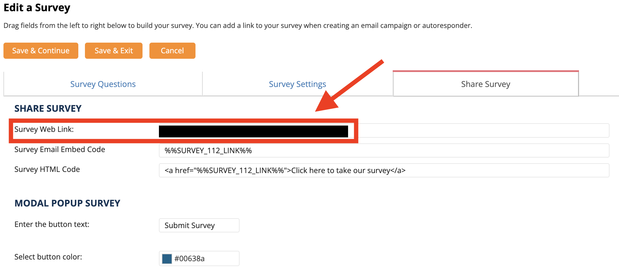 Replace [URL] with the Survey Web Link (Fig 1) in the Share Survey tab in the Survey Editor.